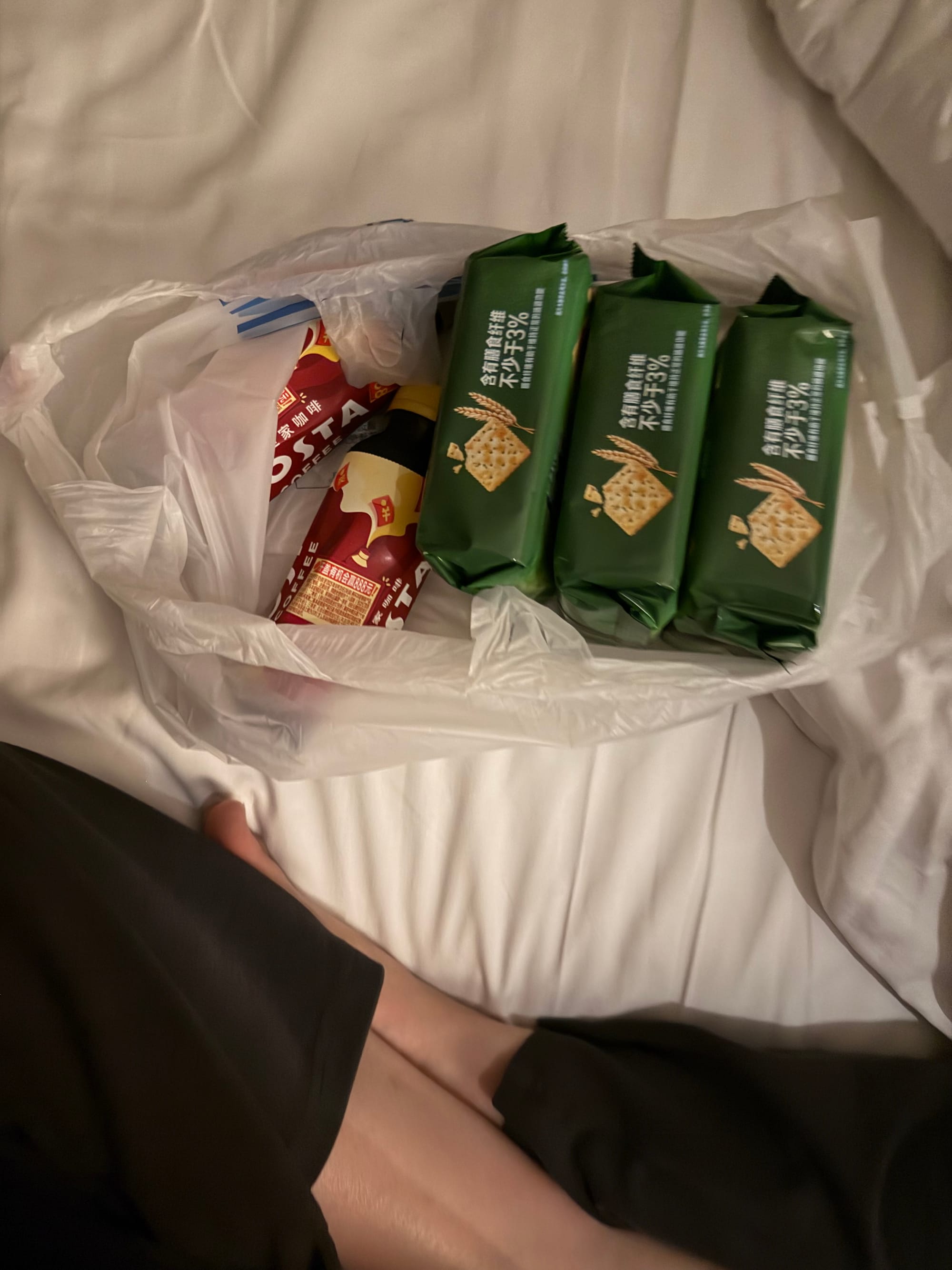 因为早上6点半就要从酒店出发去考场,昨晚十点多的时候便睡下,然后越躺越饿,一点力气也没有,怎么也睡不着。0点的时候点了个罗森的外卖,买了两包苏打饼干,顺便买好了第二天早上的咖啡,才终于入睡。